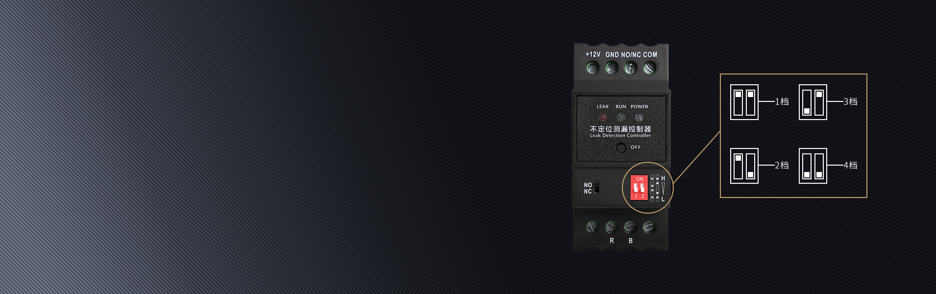 XW-DC-02 控制器面板上有一個2位4檔撥碼開關,用戶可根據檢測環境的等級要求來選擇不同的感應靈敏度(調節范圍在感應線長度的1cm—20cm內)。